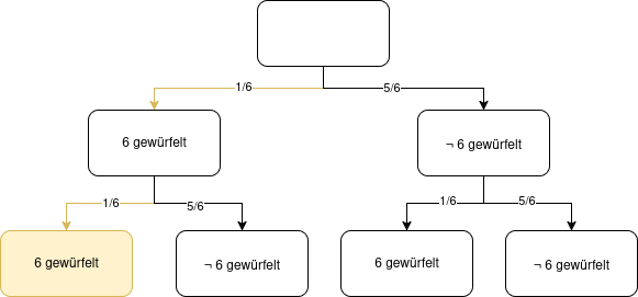Der gelb markierte Pfad entspricht unserem Ereignis. Um die Wahrscheinlichkeit zu erhalten, müssen wir die Wahrscheinlichkeit der einzelnen Stufen miteinander multiplizieren, also P(2x 6 gewürfelt) = . Kämen mehrere Blätter für uns in Frage, so würden wir für jedes Blatt genauso vorgehen und die Ergebnisse addieren.